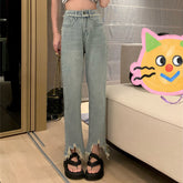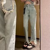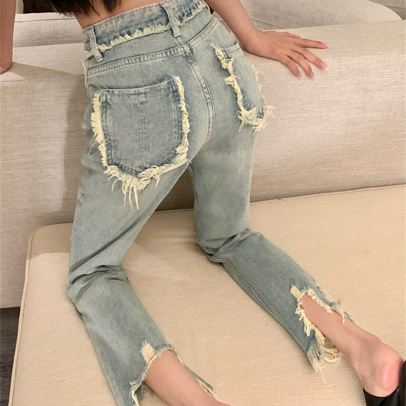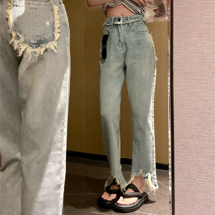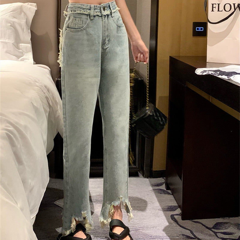 Women's Ripped Raw Fringed Straight Leg Jeans